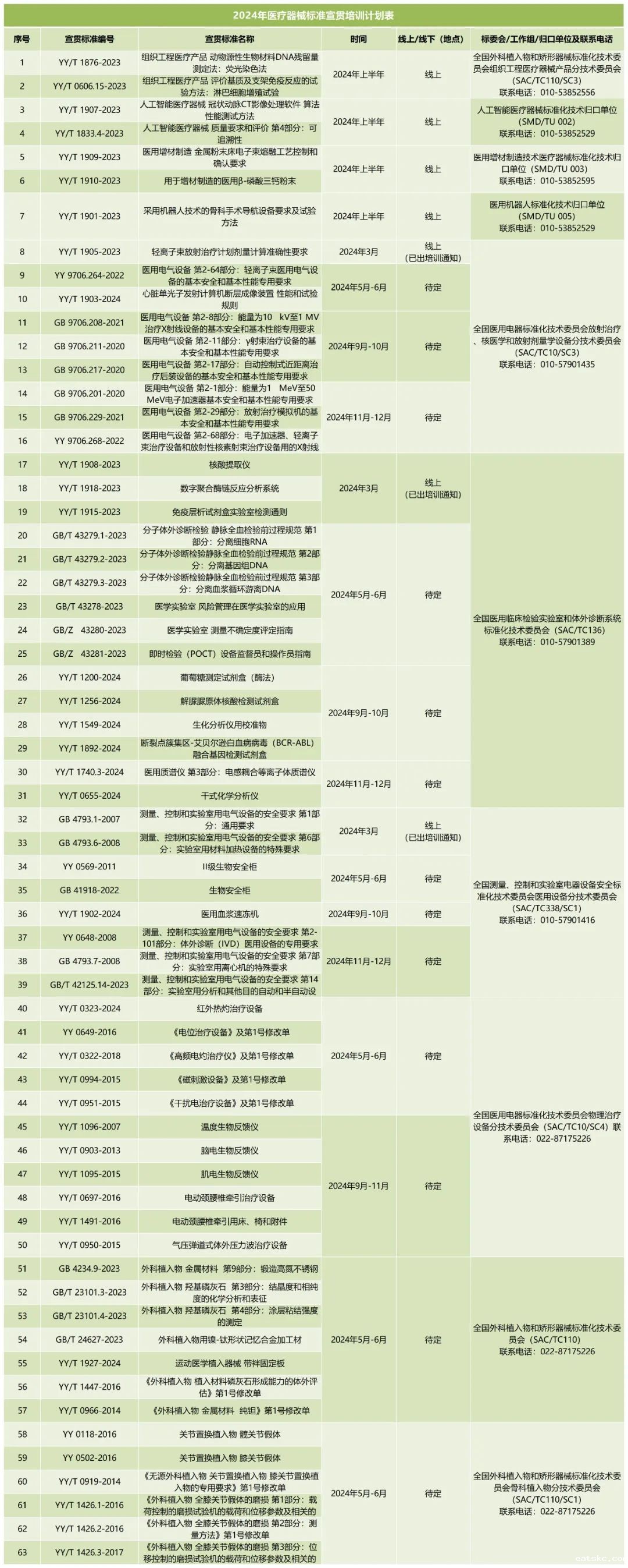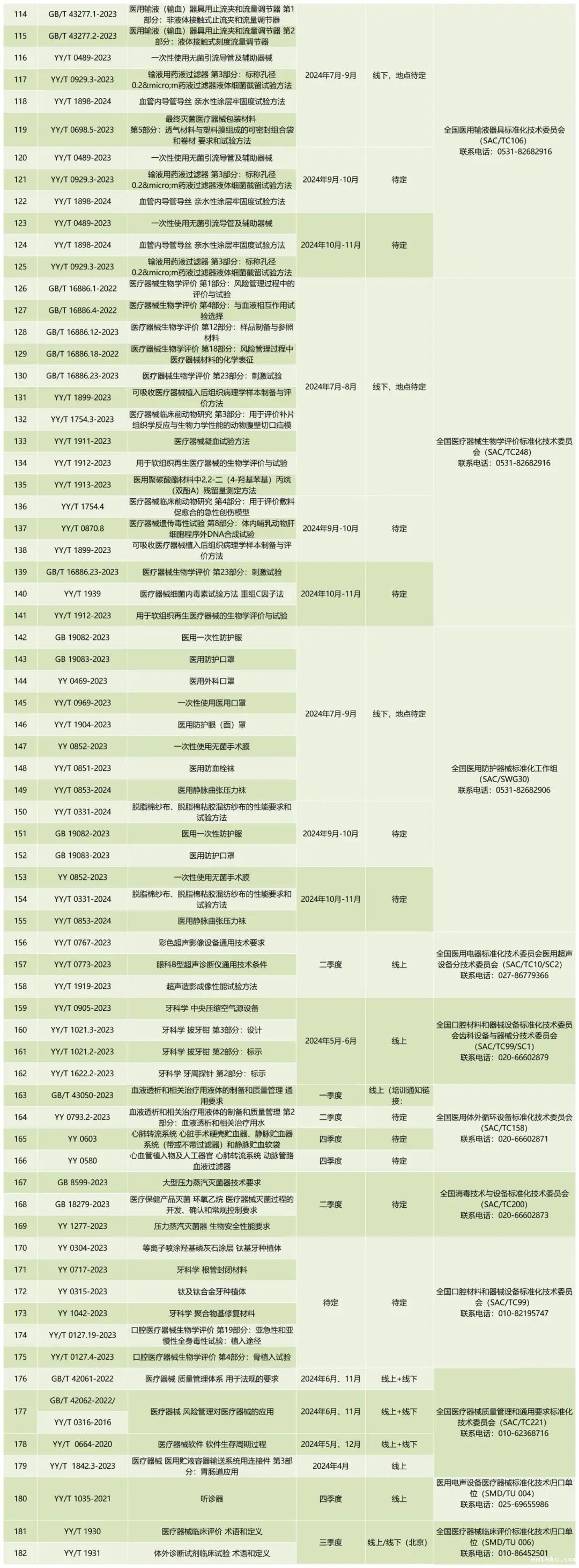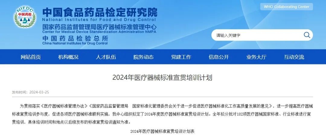 3月25日,国家药监局医疗器械标准管理中心发布《2024年医疗器械标准宣贯培训计划》,拟分批对182项医疗器械国家标准、行业标准进行宣贯培训,具体安排如下: