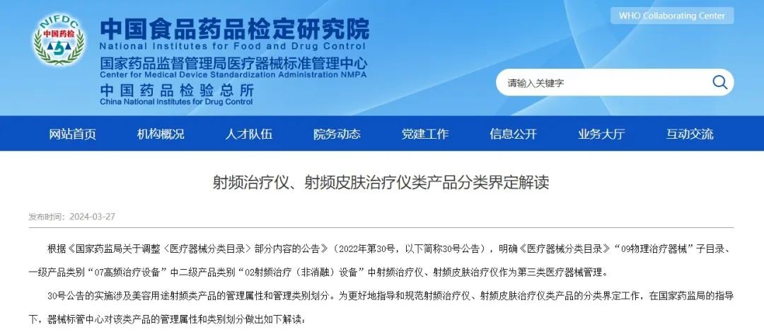 随着这一监管日期的临近,3月27日,国家药监局医疗器械标准管理中心对射频治疗仪、射频皮肤治疗仪类产品的管理属性和类别划分做出解读,具体如下: