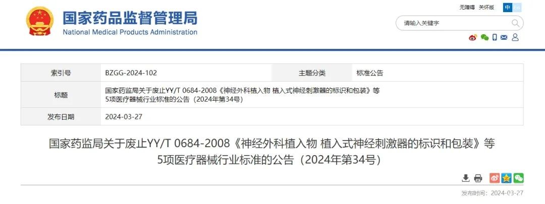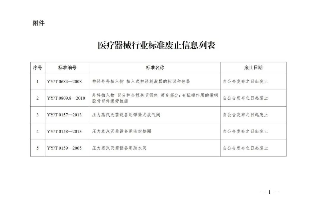 3月27日,国家药监局发布公告称,废止YY/T 0684-2008《神经外科植入物 植入式神经刺激器的标识和包装》、YY/T 0157-2013《压力蒸汽灭菌设备用弹簧式放气阀》等5项医疗器械行业标准,具体明细如下;
