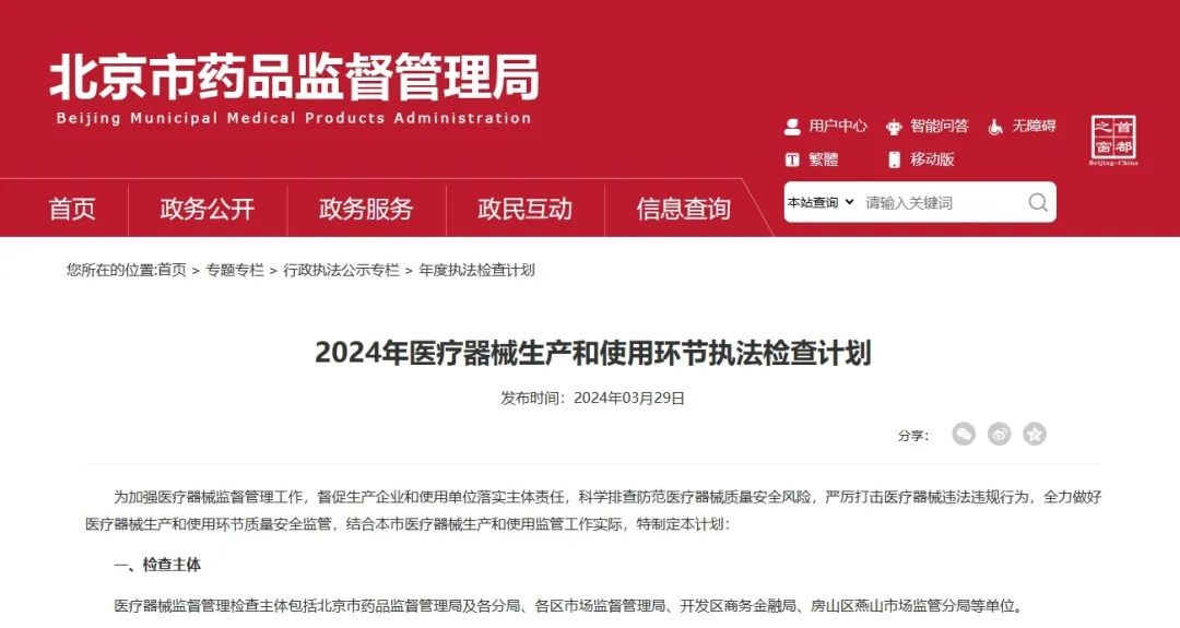 近日,北京市药监局发布《2024年医疗器械生产和使用环节执法检查计划》,其中提到,截至2023年12月31日,全市共有医疗器械生产企业1000家,医疗器械使用单位11219家。依据《医疗器械生产监督管理办法》和《医疗器械使用质量监督管理办法》要求,各级监管部门要按照计划要求,严格落实监管任务。具体如下: