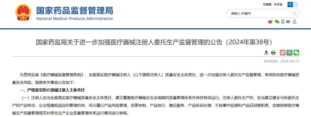 4月3日,国家药监局发布《关于进一步加强医疗器械注册人委托生产监督管理的公告(2024年第38号)》,具体内容如下: