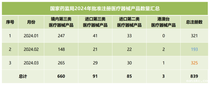 我们同步汇总了2024年第一季度国家药监局批准注册的医疗器械产品数量(见下方表格),从表格中可以看出,截至3月,2024年国家药监局总计批准注册医疗器械产品839个,其中境内第三类医疗器械产品660个,进口第三类医疗器械产品91个,进口第二类医疗器械产品85个,港澳台医疗器械产品3个。