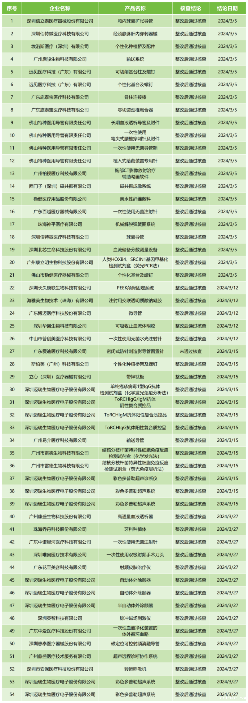 4月17日,广东省药监局官网公布2024年3月医疗器械注册质量管理体系核查结果,包括深圳迈瑞生物医疗电子股份有限公司、远见医疗科技(广东)有限公司、稳健医疗用品股份有限公司、广东花至美容科技有限公司在内的36家公司共计54款产品,其中53款产品为“整改后通过核查”,有一款产品“未通过核查”。具体明细见下方表格: