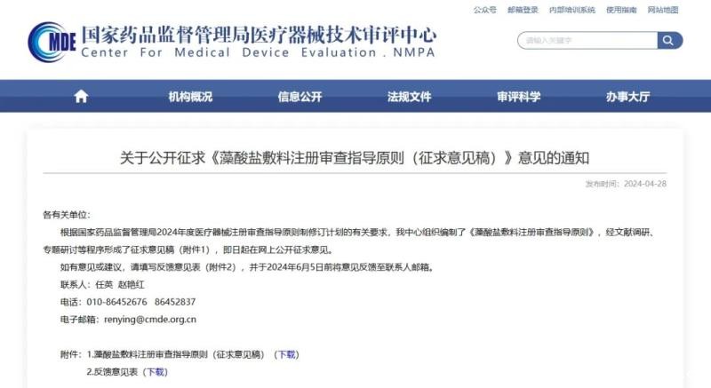 4月28日,国家药监局器审中心发布《藻酸盐敷料注册审查指导原则(征求意见稿)》(以下简称《指导原则》),并向社会公开征集意见。
