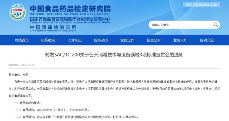 5月6日,国家药监局医疗器械标准管理中心转发了《SAC/TC 200关于召开消毒技术与设备领域3项标准宣贯会的通知》,其中提到,全国消毒技术与设备标准化技术委员会拟于2024年5月24日举办相关标准宣贯培训,培训内容为GB 18279-2023《医疗保健产品灭菌 环氧乙烷 医疗器械灭菌过程的开发、确认和常规控制的要求》等3项标准解读,具体如下: