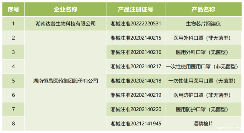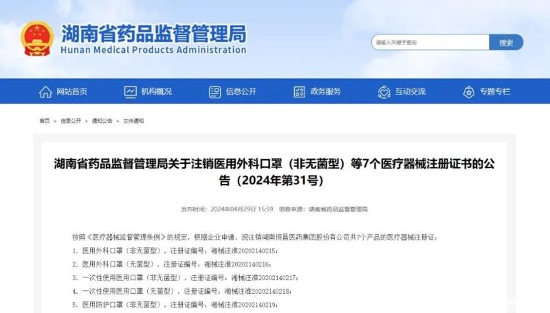 近日,湖南省药监局官网发布两则公告称,按照《医疗器械监督管理条例》的规定,根据企业申请,该局已依法注销湖南恒昌医药集团股份有公司、湖南达普生物科技有限公司2家企业的共计8个医疗器械注册证书,包括医用外科口罩、酒精棉片、生物芯片阅读仪等产品,具体明细如下:
