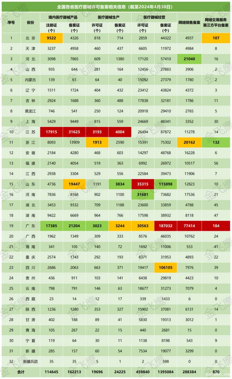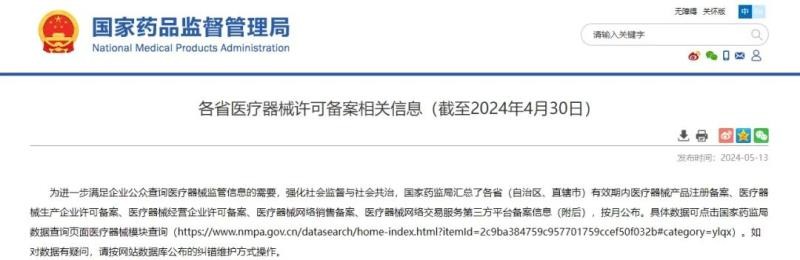 5月13日,国家药监局公布了截至2024年4月30日各省有效期内医疗器械产品注册备案、医疗器械生产企业许可备案等信息,老规矩,betway必威西盟体育官网入口小编对此稍作编辑,标注红色、绿色、黄色的分别为前三甲。