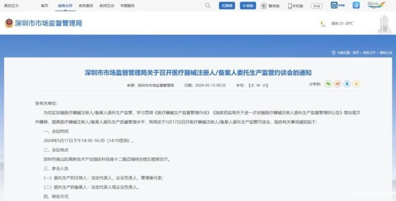 5月15日,深圳市市场监督管理局发布通知称,该局定于5月17日召开医疗器械注册人/备案人委托生产监管约谈会,有关事项具体如下: