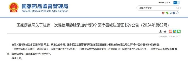 近日,国家药监局发布一则医疗器械注册证注销公告,公告显示,该局已依法注销江西三鑫医疗科技股份有限公司3个产品的医疗器械注册证,具体如下: