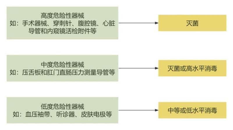 消毒水平分为高、中、低三种水平消毒类别。依据斯波尔丁分类原则,器械分为高度危险性、中度危险性和低度危险性器械,应根据其可能引起的潜在感染风险程度来确定相应的消毒水平。