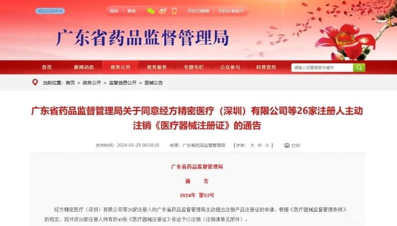5月29日,广东药监局发布通告称,深圳市贝斯曼精密仪器有限公司、比亚迪通信信号有限公司等26家注册人向广东省药品监督管理局主动提出注销产品注册证的申请,我们通过查看附件发现,注销产品以医用口罩居多,还有医用红外体温计、半导体激光治疗仪、空气波压力治疗仪、弱视综合治疗仪等共49款产品。具体清单如下: