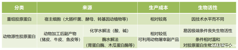 按照来源的不同胶原蛋白可分为重组胶原蛋白和动物源性胶原蛋白。重组胶原蛋白为非天然胶原蛋白,由基因工程技术合成,而动物源性胶原蛋白则从动物组织中提取。动物源性胶原蛋白生产成本较低且生产工艺相对简单。而重组胶原蛋白拥有更高的生物活性与生物相容性、更低的免疫原性、更低的漏检病原体隐患风险、更好的水溶性、无细胞毒性以及可进一步加工优化等特点,因此其应用范围更加广泛,受到市场的强烈关注。
