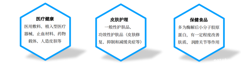 胶原蛋白因为在工业上有广泛的应用,被认为是用途最广泛的生物材料之一。由于其高蛋白质含量以及诸如吸水性、凝胶形成性和乳化稳定性的功能性属性,在食品工业中对胶原蛋白有着巨大的需求。在生物医学和制药领域,胶原蛋白有着多种应用,被用作药物、蛋白质和基因的载体,同时也可作为人造人类皮肤、血管和韧带的替代品。