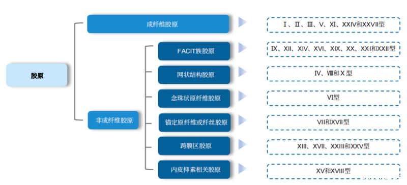 目前已鉴别出大约29种不同的胶原蛋白型别,所有的胶原纤维至少都具有一种三股螺旋结构。它们之间的区别在于成分、功能以及在体内的位置。