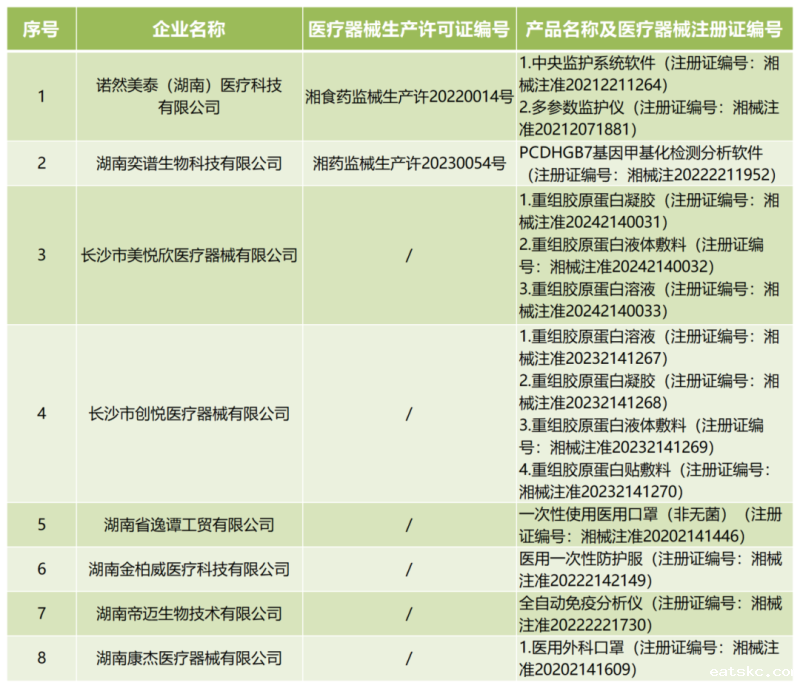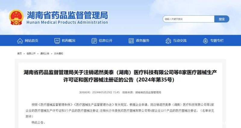 近日,湖南省药监局发布一则注销公告,其中提到,按照《医疗器械监督管理条例》《医疗器械生产监督管理办法》有关规定,根据企业申请,该局已注销诺然美泰(湖南)医疗科技有限公司等2家企业的医疗器械生产许可证和3个产品的医疗器械注册证;注销长沙市美悦欣医疗器械有限公司等6家企业12个产品的医疗器械注册证。我们通过查看附件发现,本次注销的产品中有多款重组胶原蛋白产品,比如重组胶原蛋白溶液、重组胶原蛋白凝胶、重组胶原蛋白液体敷料等,具体明细如下: