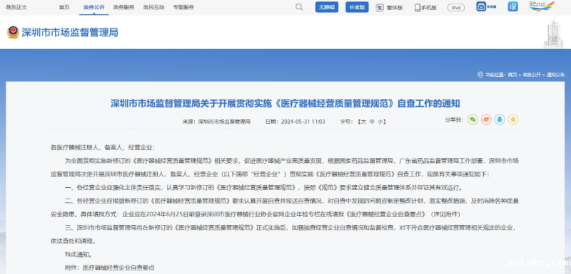 一、各经营企业应强化主体责任落实,认真学习新修订的《规范》,按照《规范》要求建立健全质量管理体系并保证其有效运行。 二、各经营企业应根据新修订的《规范》要求认真开展自查并报送自查情况,对自查中发现的问题应制定整改计划,落实整改措施,及时消除各种质量安全隐患。具体填报方式:企业应在2024年6月25日前登录深圳市医疗器械行业协会官网企业年检专栏在线填报《医疗器械经营企业自查要点》(详见附件)。 三、深圳市市场监督管理局将在新修订的《规范》正式实施后,加强抽查经营企业自查情况和监督检查,对不符合医疗器械经营管理相关规定的企业,依法查处和清理。
