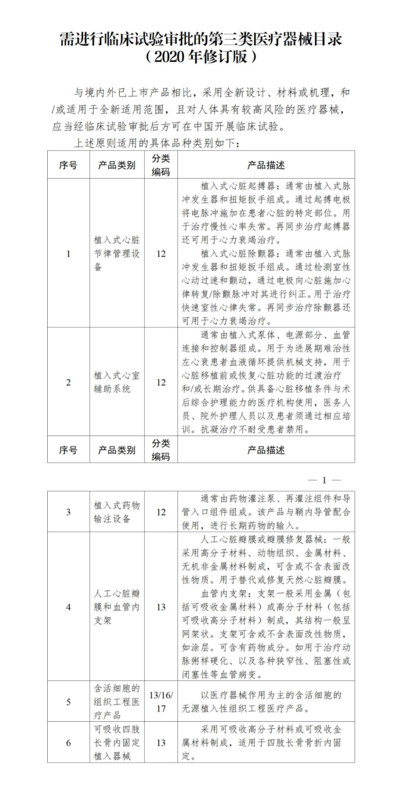 那么目前有哪些医疗器械产品需进行临床试验审批呢?根据《国家药监局关于发布需进行临床试验审批的第三类医疗器械目录(2020年修订版)的通告(2020年第61号)》,需进行临床试验审批的第三类医疗器械产品包括植入式心脏节律管理设备、植入式心室辅助系统等,具体如下: