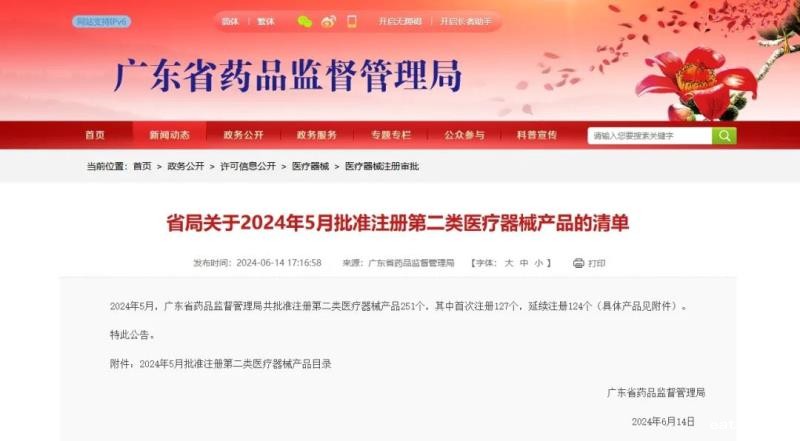 近日,广东省药监局发布公告称,2024年5月,广东省药监局共批准注册医疗器械产品251个,其中首次注册127个,延续注册124个。