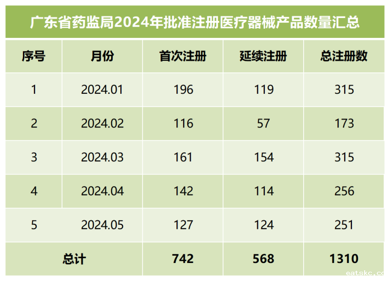 我们同步汇总了2024年前5个月广东省药监局批准注册的医疗器械产品数量(见下方表格),从表格中可以看出,截至5月底,2024年广东省药监局总计批准注册第二类医疗器械产品1310个,其中首次注册742个,延续注册568个。