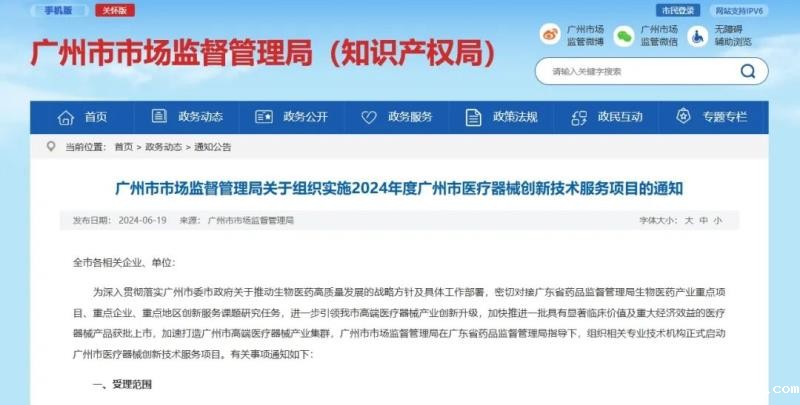 6月19日,广州市市场监督管理局发布《关于组织实施2024年度广州市医疗器械创新技术服务项目的通知》(以下简称《通知》),《通知》指出,该局已组织相关专业技术机构正式启动广州市医疗器械创新技术服务项目。具体事项如下: