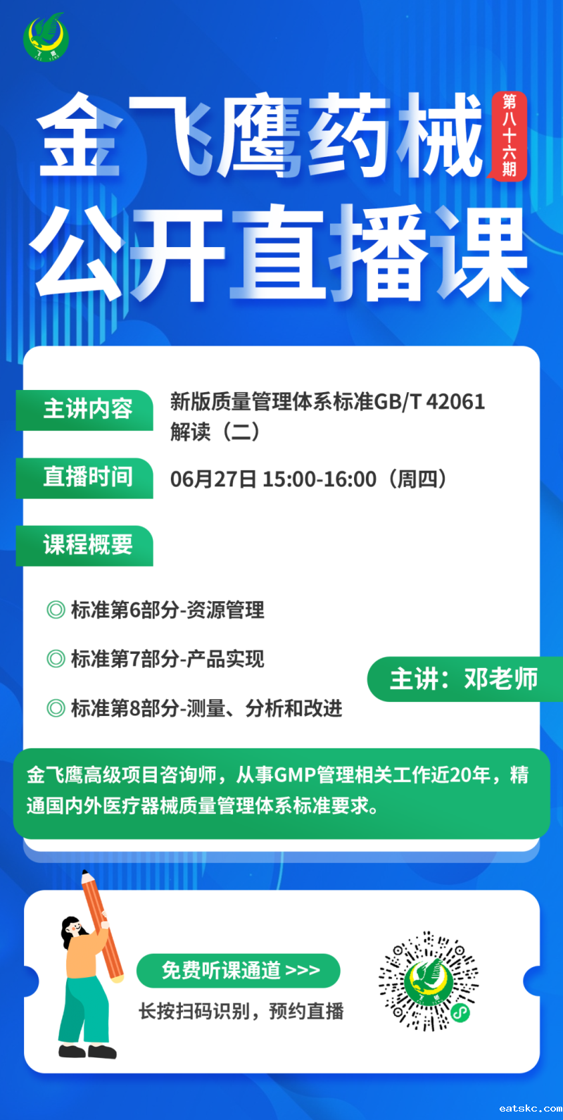 6月27日下午3点,betway必威西盟体育官网入口高级项目咨询师,从事GMP管理相关工作近20年,精通国内外医疗器械质量管理体系标准要求的邓老师,给大家带来《新版医疗器械质量管理体系标准GB/T 42061解读(二)》,培训内容是标准的第6-8部分(资源管理、产品实现、测量/分析和改进)解读,大家千万不要错过了哦!