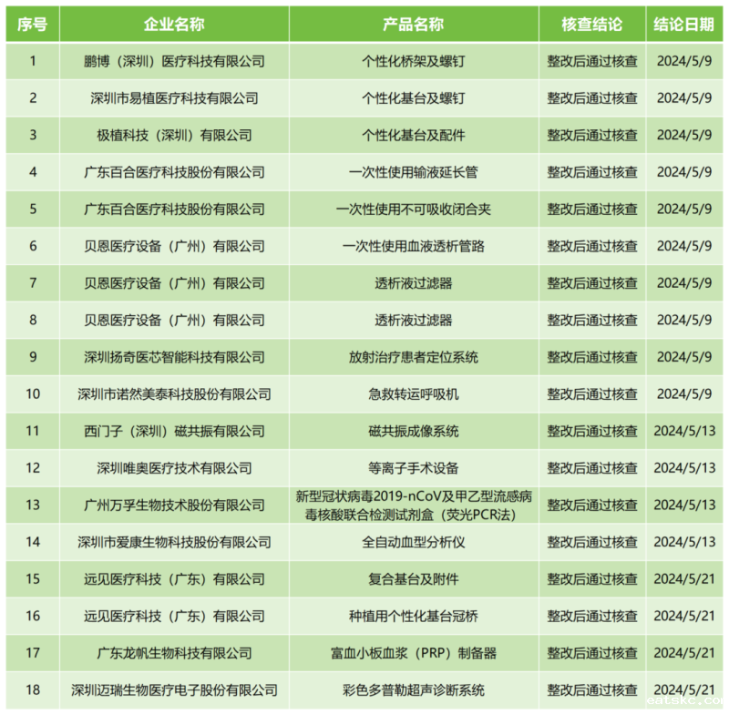 6月25日,广东省药监局官网公布2024年5月医疗器械注册质量管理体系核查结果,包括西门子(深圳)磁共振有限公司的磁共振成像系统、深圳唯奥医疗技术有限公司的等离子手术设备、深圳迈瑞生物医疗电子股份有限公司的彩色多普勒超声诊断系统等共计18款产品,均为“整改后通过核查”。具体明细见下方表格: