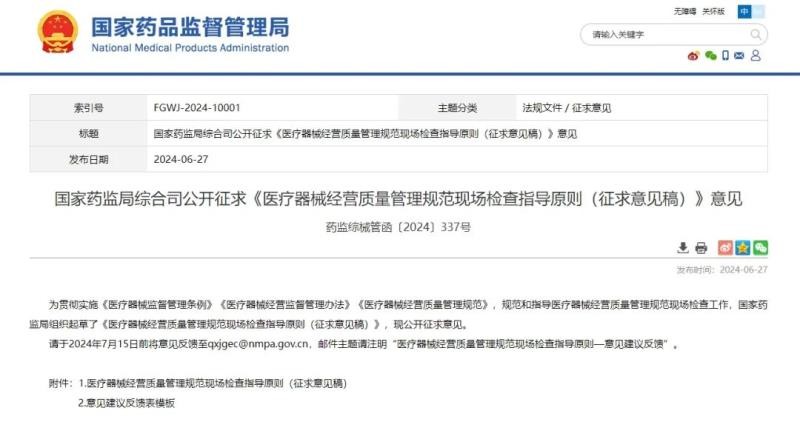 6月28日,国家药监局发布《医疗器械经营质量管理规范现场检查指导原则(征求意见稿)》(以下简称《指导原则》),并向社会公开征求意见。