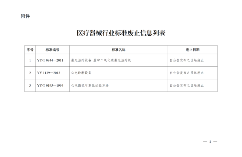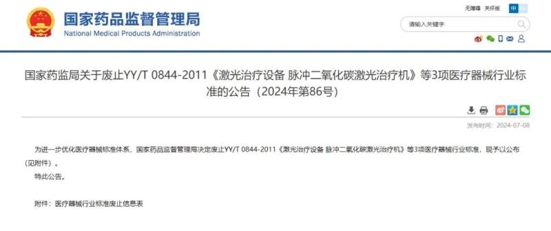 7月8日,国家药监局发布公告称,废止YY/T 0844-2011《激光治疗设备 脉冲二氧化碳激光治疗机》等3项医疗器械行业标准,具体明细如下: