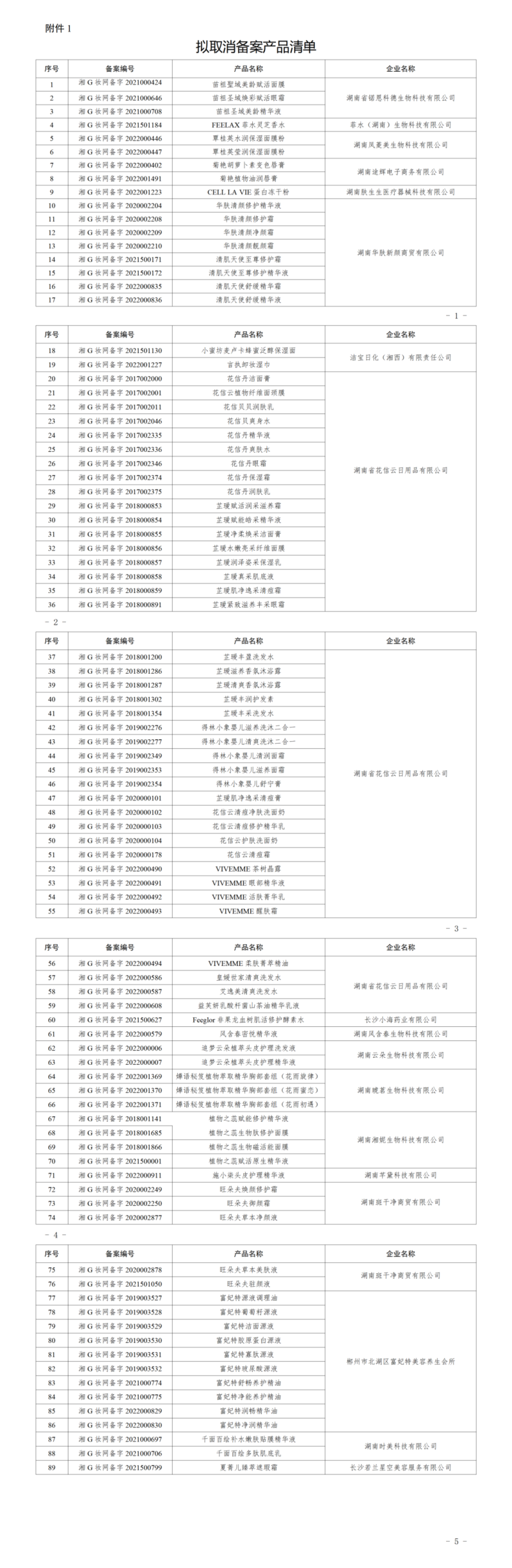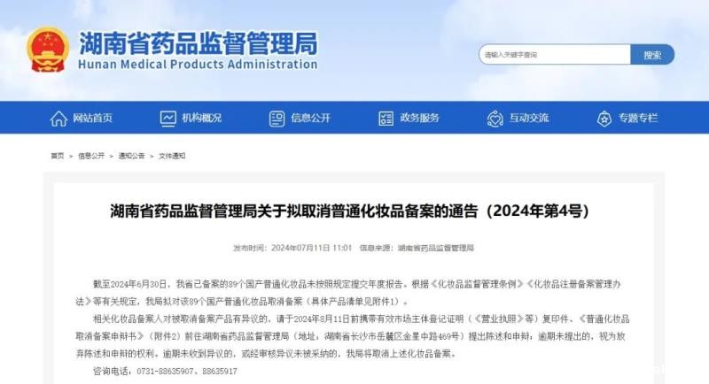 近日,湖南药监局发布《关于拟取消普通化妆品备案的通告(2024年第4号)》,其中提到,截至2024年6月30日,该省已备案的89个国产普通化妆品未按照规定提交年度报告。根据《化妆品监督管理条例》《化妆品注册备案管理办法》等有关规定,该局拟对该89个国产普通化妆品取消备案,具体产品清单如下: