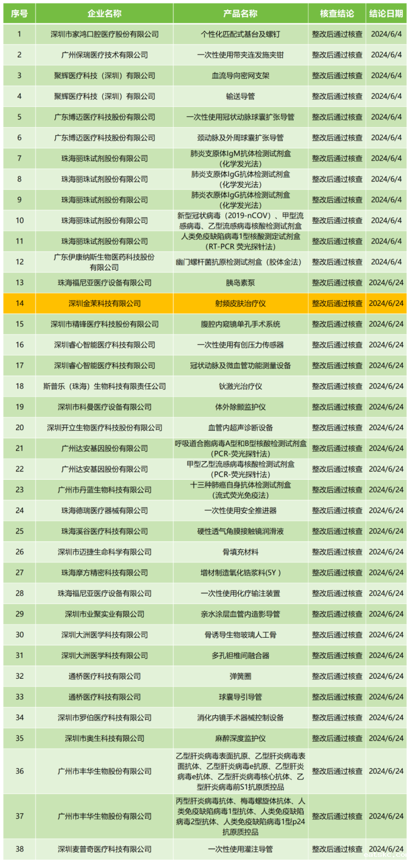 7月16日,广东省药监局官网公布2024年6月医疗器械注册质量管理体系核查结果,包括深圳市家鸿口腔医疗股份有限公司的个性化匹配式基台及螺钉、珠海福尼亚医疗设备有限公司的胰岛素泵、深圳金茉科技有限公司的射频皮肤治疗仪等共计38款产品,均为“整改后通过核查”。具体明细见下方表格: