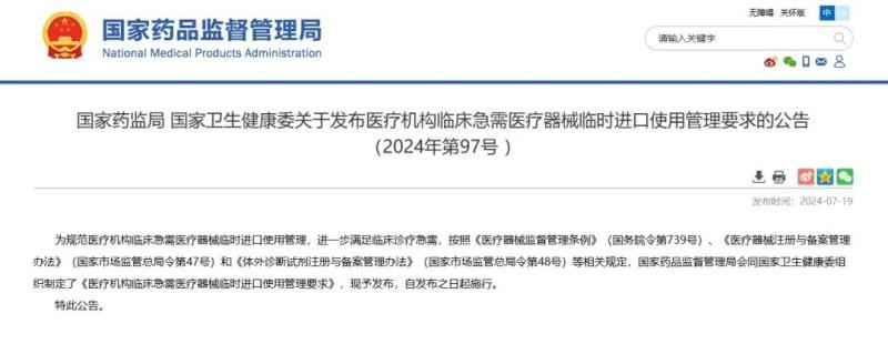 7月19日,国家药监局《医疗机构临床急需医疗器械临时进口使用管理要求》(以下简称《管理要求》),并宣布自发布之日起施行。