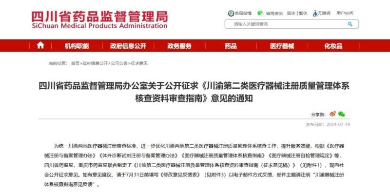 按照《深化川渝政务服务合作2024年重点工作任务清单》工作计划,为统一川渝两地医疗器械注册审查标准,进一步优化川渝两地第二类医疗器械注册质量管理体系核查工作,明确资料审查的适用条件及核查形式,提升服务效能,避免重复检查,结合工作实践,参考《医疗器械注册与备案管理办法》《体外诊断试剂注册与备案管理办法》《医疗器械注册质量管理体系核查指南》《医疗器械注册自检管理规定》等相关规定,联合制定本指南。