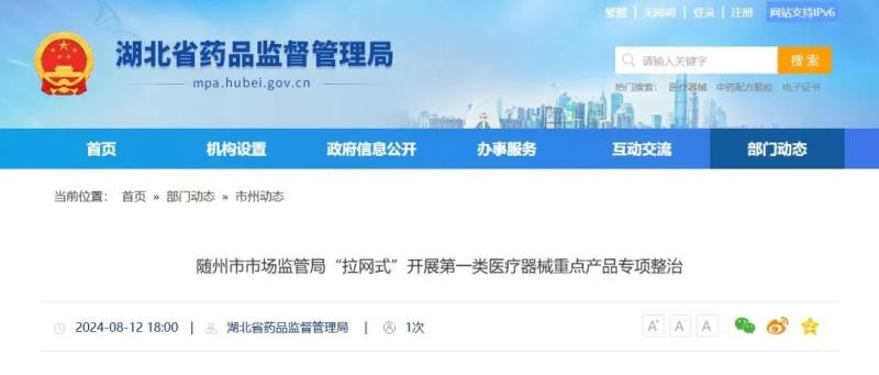 近日,湖北药监局发布动态称,为进一步规范第一类医疗器械备案、生产及经营行为,保障医疗器械质量安全,随州市市场监督管理局根据《省药品监督管理局办公室关于开展第一类医疗器械重点产品专项监督检查的通知》要求,在全市“拉网式”全面开展了第一类医疗器械重点产品专项整治。
