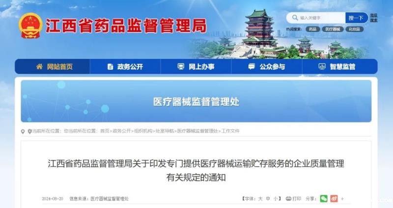 8月20日,江西省药监局发布《专门提供医疗器械运输贮存服务的企业质量管理有关规定》(以下简称《规定》),并宣布自2025年1月1日起施行。