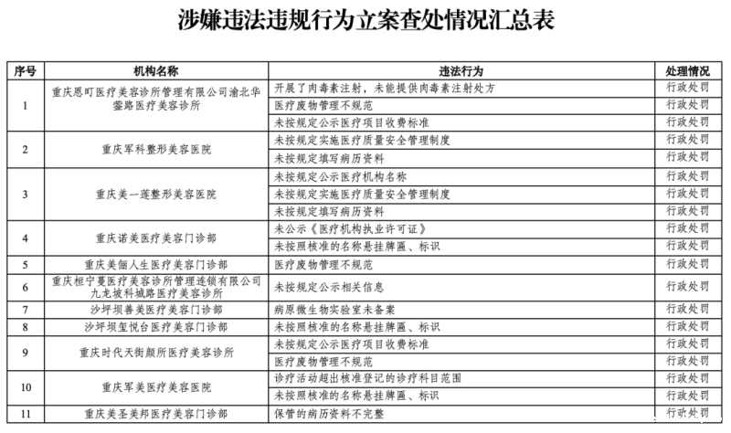 据了解,为及时回应群众关切,促进重庆市医疗美容行业高质量发展,7月31日至8月13日,重庆市卫生健康委联合市药品监督管理局,并邀请成都市卫生计生监督执法支队、四川省卫生健康委监督执法局执法人员,组成6个联合交叉执法检查组,对22家医疗美容机构开展了突击检查。据悉,被检查的医疗美容机构均由群众“点名”产生,分布于渝中区、江北区等7个区。