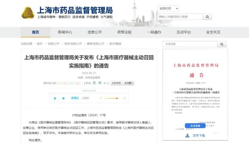 8月27日,上海市药监局发布《上海市医疗器械主动召回实施指南》(以下简称《实施指南》),以指导医疗器械注册人备案人、经营企业、使用单位做好医疗器械主动召回工作。