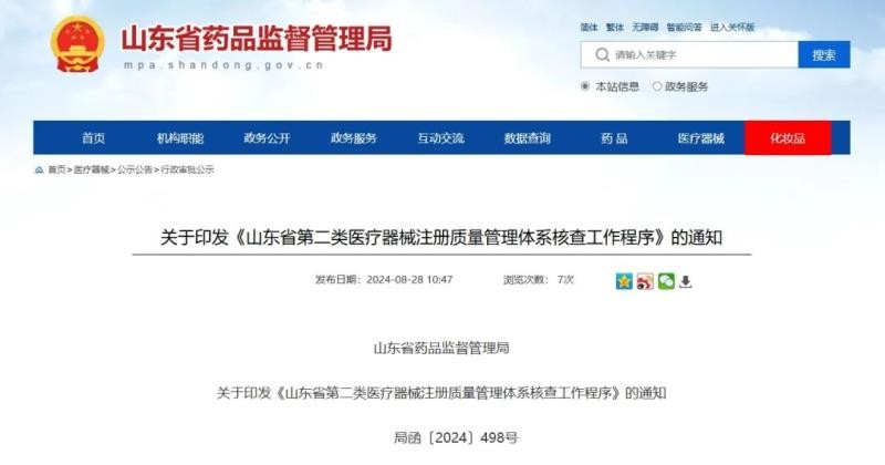 8月28日,山东省药监局发布新版《山东省第二类医疗器械注册质量管理体系核查工作程序》(以下简称《工作程序》),并宣布自发布之日(2024年8月28日)起施行。