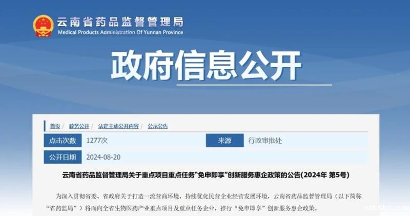 近日,云南省药监局发布公告称,为深入贯彻省委、省政府关于打造一流营商环境,持续优化民营企业经营发展环境,该局将面向全省生物医药产业重点项目及重点任务企业,推行“免申即享”创新服务惠企政策。具体如下: