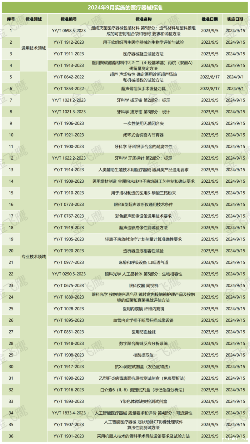 8月最后一个工作日,按照咱们的老规矩,在某月有较多医疗器械标准实施的情况下,我们都会汇总整理分享给大家,那么本期文章我们就给大家盘点一下2024年9月起即将实施的36项医疗器械标准,这其中有自2024年9月1日起实施的,也有自2024年9月15日起实施的,如YY/T 0698.5-2023《最终灭菌医疗器械包装材料 第5部分:透气材料与塑料膜组成的可密封组合袋和卷材 要求和试验方法》、YY/T 0767-2023《彩色超声影像设备通用技术要求》等,具体清单如下: