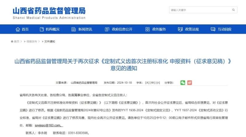 近日,山西省药监局在原有《定制式义齿首次注册标准化申报资料(征求意见稿)》基础上进行修改完善,附件共包括首次注册申报资料及要求、符合性声明、风险分析资料、产品技术要求、说明书及标签样稿等,并再次向社会公开征求意见。