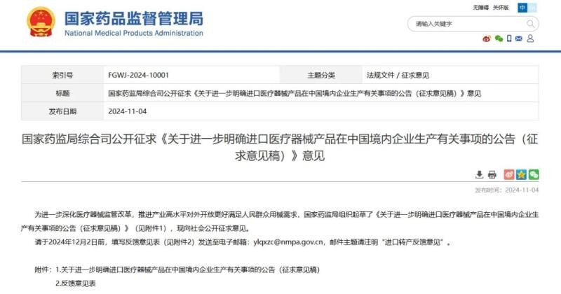 11月4日,国家药监局发布《关于进一步明确进口医疗器械产品在中国境内企业生产有关事项的公告(征求意见稿)》(以下简称《公告》),并向社会公开征求意见。