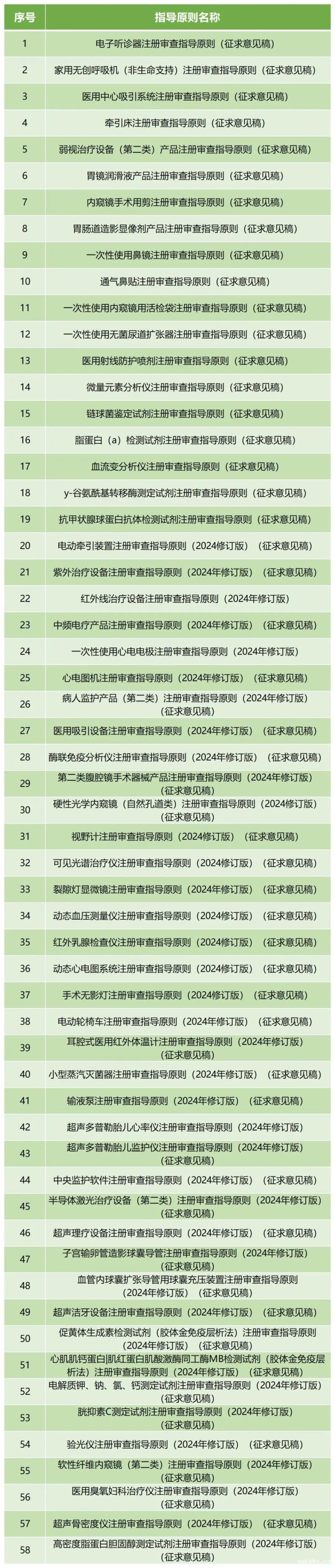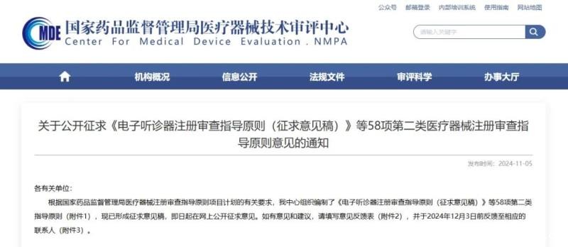 11月5日,国家药监局器审中心发布《电子听诊器注册审查指导原则(征求意见稿)》《弱视治疗设备(第二类)产品注册审查指导原则(征求意见稿)》《通气鼻贴注册审查指导原则(征求意见稿)》等58项第二类医疗器械注册审查指导原则,并向社会公开征求意见,意见反馈时间:2024年12月3日前。我们通过查看附件中的指导原则名称发现,本次发布的指导原则中共有19项为新制定,其他均为2024年修订版。具体清单如下: