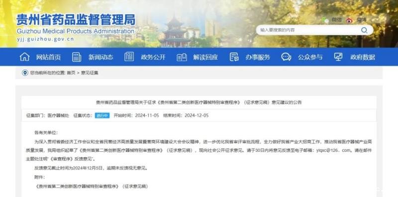 近日,贵州省药监局发布《贵州省第二类创新医疗器械特别审查程序》(征求意见稿)(以下简称《程序》),并向社会公开征求意见。