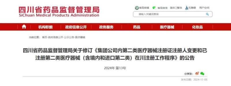 近日,四川省药监局发布了新版《集团公司内第二类医疗器械注册证注册人变更和已注册第二类医疗器械(含境内和进口第二类)在川注册工作程序》,具体内容如下: