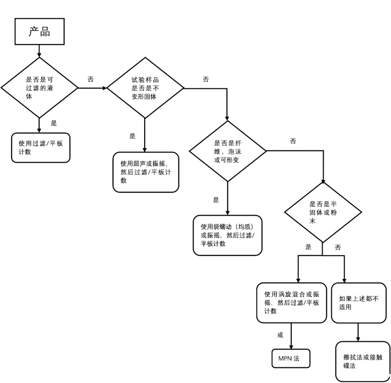 生物负载测定方法学层面,主要参照ISO 11737-1、GB/T 19973.1和YY/T 1737等标准进行方法开发和确认。在完成方法确认后,采用经确认的方法进行生物负载的常规测定。在方法开发时,可采用图2所示的决策树进行生物负载测定方法的选择。在方法确认时,首先应参考药典等文件进行方法适用性试验;其次,当生物负载测定法包括从产品中采集微生物时,应对采集和培养过程的生物负载回收率进行确认。应视产品上微生物数量的情况选择重复回收法或者产品接种法进行生物负载回收率确认试验。