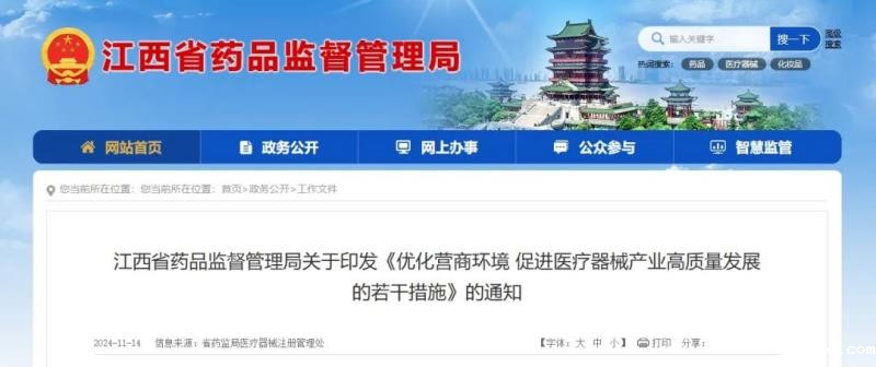 11月14日,江西省药监局发布《优化营商环境 促进医疗器械产业高质量发展的若干措施》(以下简称《若干措施》),并宣布《江西省药品监督管理局关于印发〈优化营商环境 促进医疗器械产业高质量发展“十三条”惠企政策〉的通知》(赣药监规〔2022〕7号)和《江西省药品监督管理局关于做好优化营商环境 促进医疗器械产业高质量发展“十三条”惠企政策实施工作的通知》(赣药监规〔2022〕10号)同时废止。