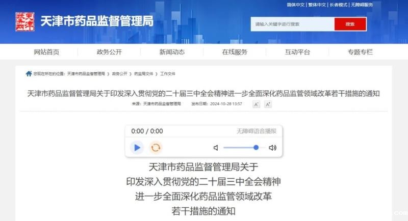 近日,天津市药监局发布《深入贯彻党的二十届三中全会精神进一步全面深化药品监管领域改革若干措施的通知》(以下简称《若干措施》),以落实天津市委十二届六次全会和国家药监局全面深化改革部署要求,全链条支持生物医药产业高质量发展,全生命周期保障药品高水平安全,全方位加强高效能监管和高素质专业化干部队伍建设。《若干措施》以更好保护和促进人民健康为目标,共制定4个方面27条深化药品监管领域改革具体措施。