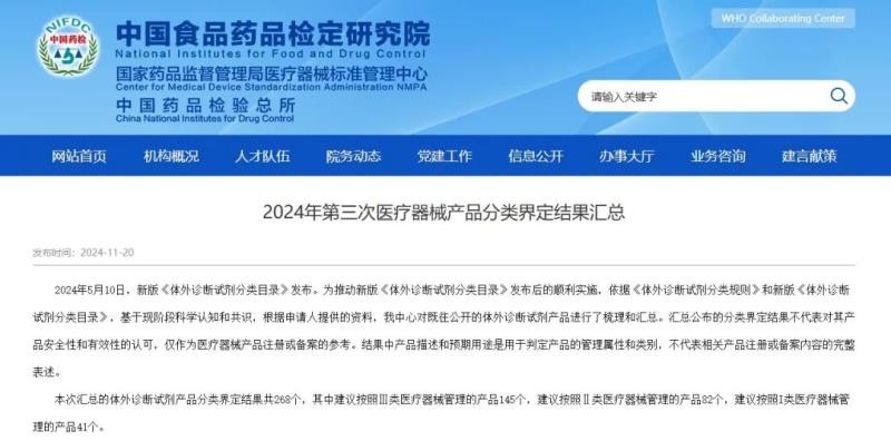 11月20日,国家药监局医疗器械标准管理中心发布《2024年第三次医疗器械产品分类界定结果汇总》,本次汇总的均为体外诊断试剂产品,共有268个,其中建议按照Ⅲ类医疗器械管理的产品145个,建议按照Ⅱ类医疗器械管理的产品82个,建议按照Ⅰ类医疗器械管理的产品41个。