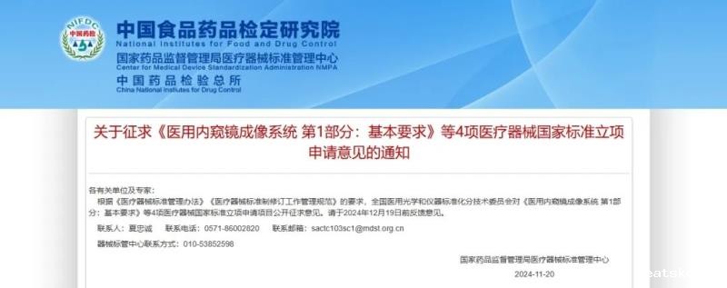 11月20日,国家药监局医疗器械标管中心发布《医用内窥镜成像系统 第1部分:基本要求 》《医用内窥镜成像系统 第4部分:荧光性能》《医用内窥镜成像系统第5部分:3D性能》《角膜塑形用硬性透气接触镜》共4项2025年医疗器械国家标准立项申请意见的通知,同时随附了各项标准草案,并向社会公开征求意见。