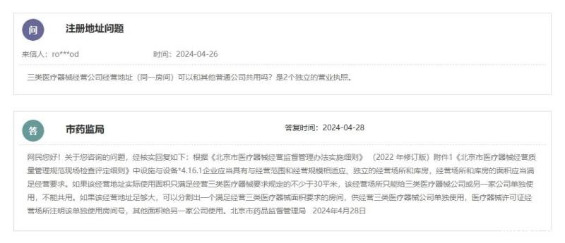 根据北京市药监局的答复,《北京市医疗器械经营监督管理办法实施细则》(2022 年修订版)附件1《北京市医疗器械经营质量管理规范现场检查评定细则》,其中“设施与设备”章节4.16.1规定:“企业应当具有与经营范围和经营规模相适应、独立的经营场所和库房,经营场所和库房的面积应当满足经营要求。”